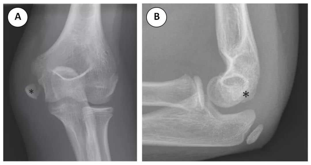 图 7 9 岁女子体操运动员从平衡木上摔下后肘部内侧疼痛。(A) 肘关节正位片示内上髁撕脱性骨折 (星号),骨折向远端移位。(B) 肘部侧位片图。注意,无关节积液。此外,内上髁 (星号) 位于肘关节的背侧。随着进一步的撕脱,内上髁将进一步移动到肘关节的前 / 掌侧。