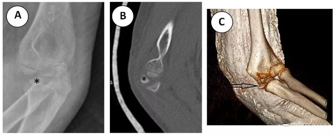 图 8 一个 12 岁的男孩在学校上体育课时摔倒了。(A) 肘部 x 线片斜位显示尺骨 - 滑车沟撕脱性内上髁 (星号) 骨折。(B) 矢状位 CT 和 (C) 肘部轴向薄层 CT 三维重建显示,在尺骨滑车沟内也发现了类似的内上髁 (星号,箭头)。可见内上髁上方未分化、正常、碎片化的滑车骨化中心。