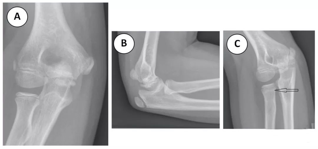图 9 (A) 肘部正位片未显示任何异常,特别是桡骨颈。(B) 肘关节侧位片未见关节积液。(C) 肘部前视图显示桡骨颈硬化 (箭头),提示 Ⅱ 期愈合的无移位桡骨颈骨折。