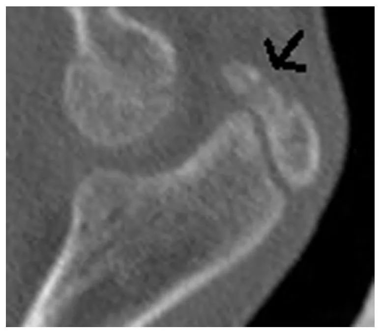 图 11 肘关节矢状位 CT 图像显示鹰嘴呈现多个骨化中心 (箭头),这是一个影像学陷阱,其实这是一个正常的鹰嘴骨化中心。