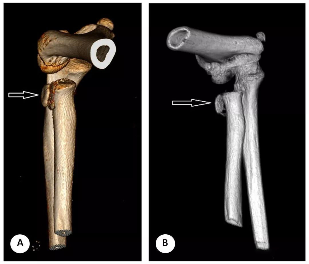图 10 (A、B) 获得此 CT 用于手术计划,并根据肘关节轴位薄层 CT 重建三维重建。这名 8 岁的病人表现为近端桡骨严重移位的 Salter-Harris II 型骨折。术前肘关节 CT 显示桡骨近端骨骺翻转移位 270 度 (箭头所指)。