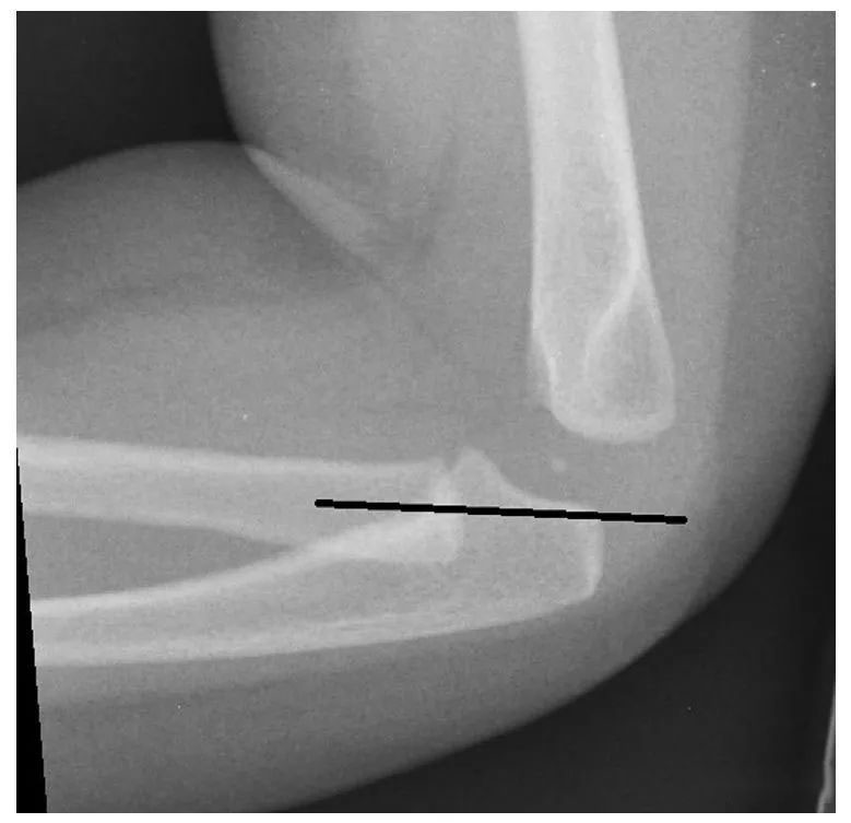 图 13 肘关节侧位片显示肱桡关节脱位。桡肱小头线 (箭头) 中断,与肱骨小头不相交,肘关节积液,未发现尺骨骨折。