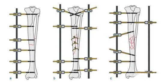 外固定支架的具体操作顺序是一个复位、穿针与固定的交替。