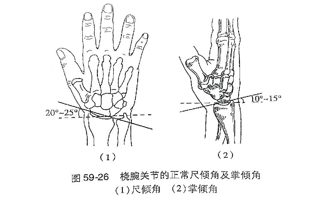桡骨远端关节面呈由背侧向掌侧、由桡侧向尺侧的凹面, 分别形成掌倾角 (10°~15°) 和尺倾角 (20°~25°)。