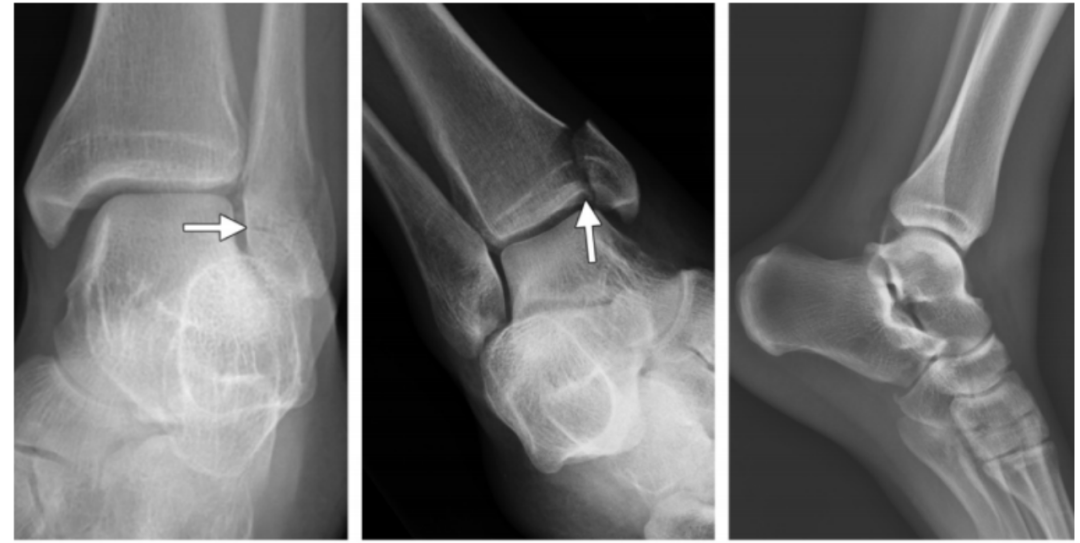 II 度损伤 X 线片显示:腓骨无骨折,内踝间隙变宽,提示三角韧带断裂;侧位片显示后踝骨折(箭头)。