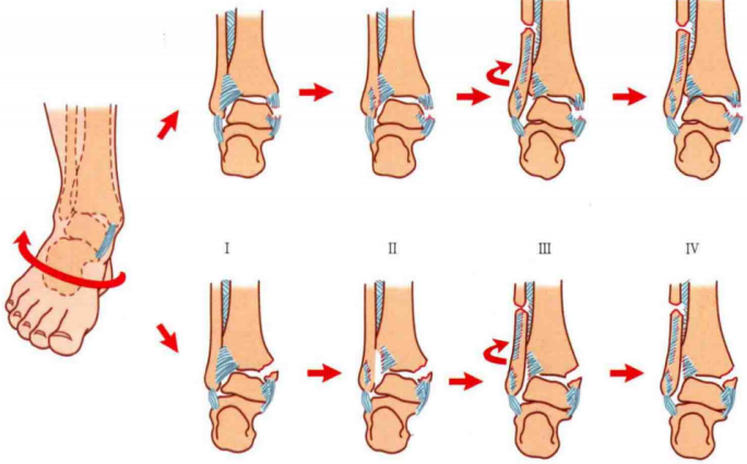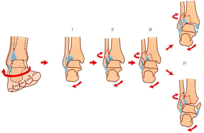 Ⅰ度:首先发生的是外侧副韧带撕裂或者外踝的撕脱骨折,由于损伤发生于下胫腓联合远端,该韧带多保持完整。