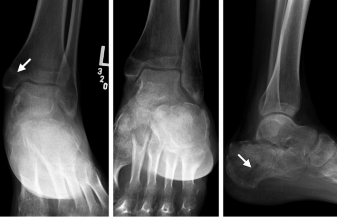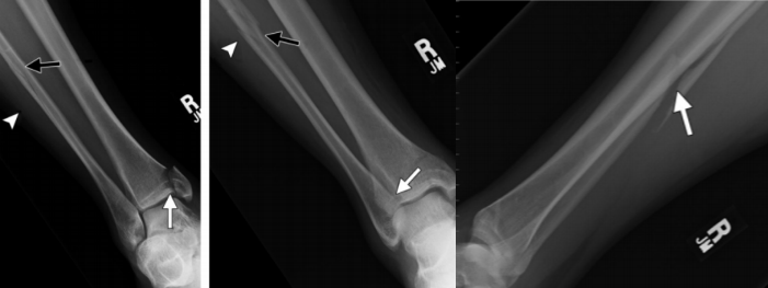Ⅲ 度:距骨外展的力量作用于腓骨,使其外侧受到压力,内侧受到张力,导致腓骨在胫骨关节面附近发生短斜形骨折,主要骨折线基本呈横行,常伴有三角形小骨片,或者外部粉碎型的骨折;甚至可以伴有胫骨远端关节面外侧部分的压缩骨折。