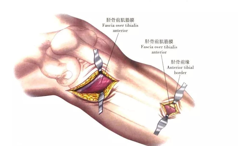 图3远端在胫骨脊外侧约2cm处并与其平行做一长约5~6cm纵向切口。远端切口的大小及长度由需要手术的病理范围及所使用的内固定确定。