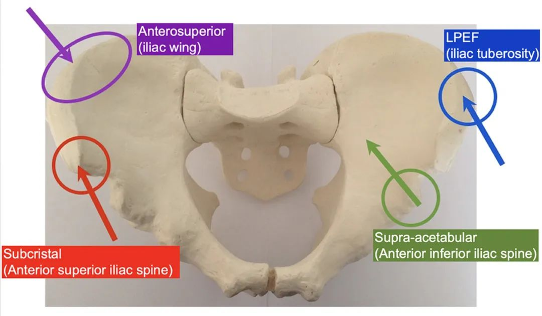 (1) 前上颌骨,针垂直于髂嵴插入,
