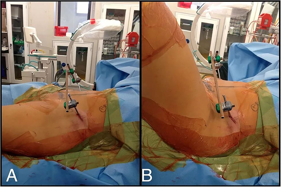 并发症的相关风险包括针错位、固定缺失、神经血管损伤和感染。我们使用侧后方进针点固定技术,我们将其命名为侧后方外固定器 (LPEF),并描述了其初步临床结果。使用外侧髂嵴的结节部分作为可识别的标志,我们可以生成一个侧向入口点并向后定向,从而将我们的针定位在离坐姿引起的腹股沟折痕和皮肤褶皱更远的地方(图1)。