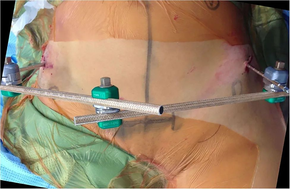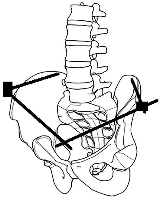 外固定器结构由2根或3根碳纤维杆完成,用针对杆夹和杆对杆夹连接,通过外部操纵或牵引相结合来减少骨盆,通常使用针作为 “操纵杆”。