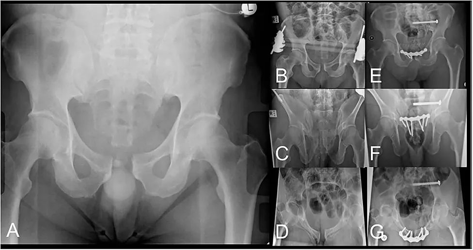 图 6骨盆损伤的AP骨盆X光片(A)分类为左侧APC2。LPEF应用后的AP (B)、出口(C)和入口(D)射线照片显示骨盆对线得到改善,等待最终的手术治疗。AP (E)、出口(F)和入口(G)的X光片在去除LPEF后最终固定后。