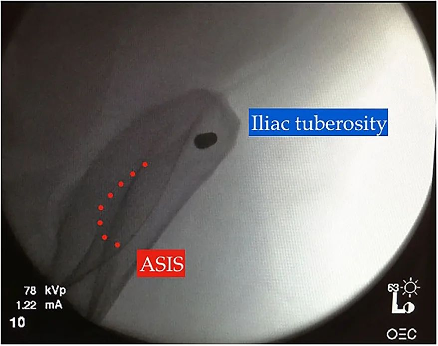 当髂嵴向后和向内弯曲时,触诊髂嵴的结节部分。这些地标用外科标记笔勾勒出来(图2)。在髂嵴结节部分的上外侧至下内侧方向上做一个2厘米的切口,根据需要允许切口延伸。
