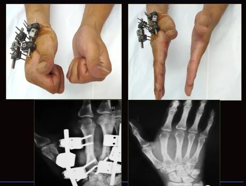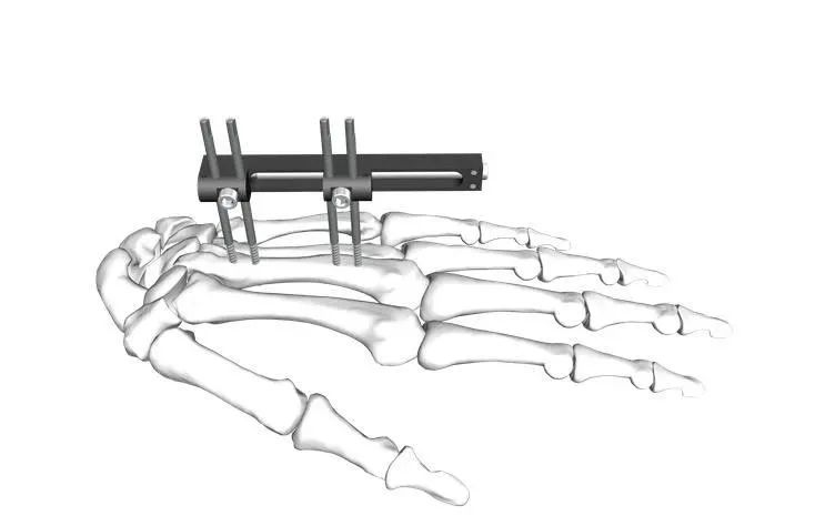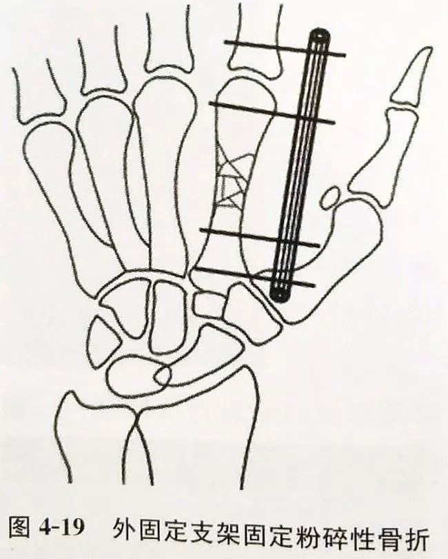 粉碎性掌指骨骨折由于骨支架被破坏,有时手术切开也难以解剖复位或无法坚强内固定。外固定支架使粉碎性骨折在牵引的作用下可恢复并维持其长度,起到相对固定的作用。