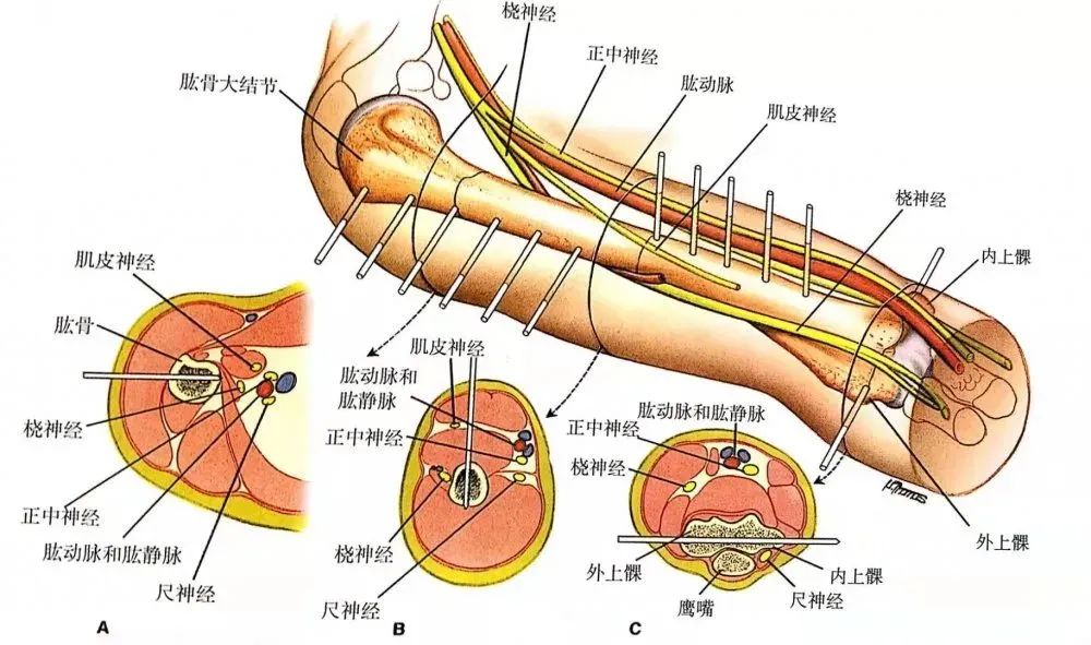 正中神经同肱动脉一同走行,在上臂的上2/3神经位于肱骨的内侧,在肱骨远端1/3神经向外侧移行并在肘关节水平位于肱骨的前方。