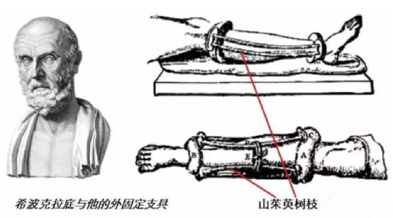 外固定支架在国外最早描述者是大名鼎鼎的医学之父希波克拉底,他曾经发明过一个骨折治疗装置,用的是长短不同的3~4套山茱萸树枝,将它们绷弯了以后,放置在骨折肢体的四周,以起到伤肢稳定、骨折端牵开的效果。与单纯起到稳定作用的支具不同,这个装置具有对骨折实施主动牵伸等干预的能力,已经相当于外固定支架的一个雏形了。遗憾的是,在他之后的近2000年中,人类在这方面没有什么新的概念进步。