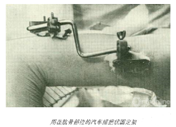 接下来,霍夫曼又设计了一种他称之为“Grip”(原意:紧握)的针夹。这种针夹是两片紧闭的金属板,可以紧紧“握” 住骨针,另一头则以球窝关节与外固定棒相连接,凭借着球窝关节的万向活动力,手术医生可以对骨折块进行任意的复位。这种新式外固定支架的好处在于:操作异乎寻常的简便、快速,而且固定力又相当的可观。霍夫曼为他的新式支架还设计了不同的造型,以适应各种部位的需要,例如股骨近端的星状持钉夹、用于肱骨的汽车摇把状固定棒(绕开桡神经)。