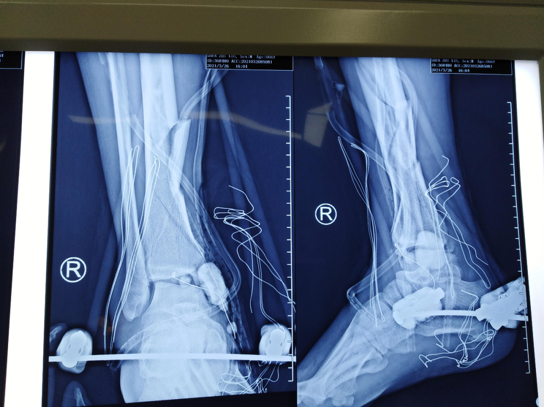 该患者车祸伤入院,入院查体可见右内踝皮肤缺损面积约5cm*10cm,右足背部皮肤脱套伤,内踝缺如。患者既往高血压、糖尿病,一直服用利血平及阿司匹林。利血平一般建议停用2周,阿司匹林建议停用1周方能进行麻醉。不手术,患者开放性损伤,持续流血状态,失血过多会发生生命危险。手术的话,服用利血平有术中发生血压不能维持,呼吸心跳骤停的风险。麻醉医师团队及创伤骨科医师团队面临双重风险,两害相权取其轻。患者开放性损伤,时间就是生命。面对困难,勇于承担,经患者及家属同意,第一时间进行了第一次清创+外固定支架固定+VSD负压引流手术。后续又进行了第二次清创+外固定支架调整+抗生素骨水泥链植入+克氏针固定踝关节骨折+VSD负压引流手术。第三次清创+骨折复位螺钉内固定+内踝重建+Ilizarov环形外固定固定+VSD负压引流手术。手术均进行顺利。