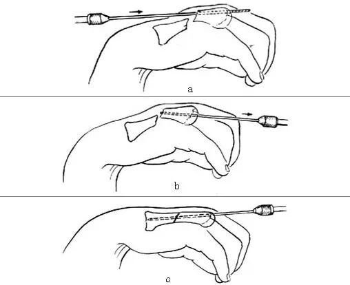 2.闭合性掌、指骨骨折仅在复位失败,或复位困难(如骨折时间过久)或不稳定性骨折时,行切开复位内固定术。