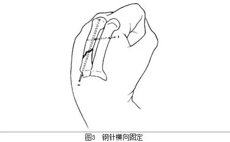 2.不稳定型掌骨骨折用单针贯穿固定后,如骨折端不稳定,可自骨折的远折段横向穿入根克氏针,与相邻的掌骨横向固定[图3]