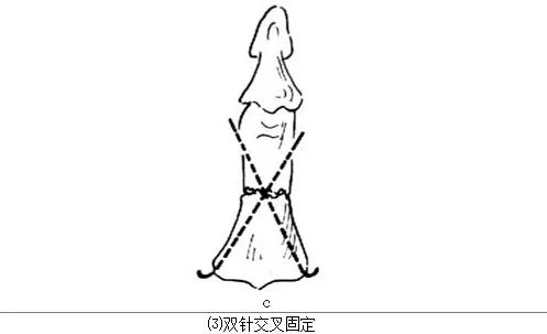 双针交叉固定:多用于指骨骨折,其步骤如下:①先将骨折远端撬出,用手摇钻稍偏尺侧和桡侧,斜向钻入两根克氏针,分别从指骨头部近侧的桡侧面和尺侧面钻出皮肤,针不应贯穿指骨头;②将手摇钻换到克氏针的远端,将克氏针向远端退针,直至针尖与远折端持平;③骨折复位后,摇动手摇钻使两根克氏针分别自指骨基底部远侧的尺侧面和桡侧面穿出,针也不应穿过关节面;④再将手摇钻换到克氏针的近端,向近端退针,直到针尖刚露出皮质骨1~2mm为止[图2剪去近端多余的克氏针,尾端弯成钩状,埋于皮下。