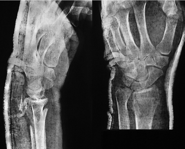 图2-1 桡骨远端背侧因骨折的粉碎性质而缺损巨大,背侧的皮质骨碎片向远端移位至桡腕关节间隙水平并嵌于腕背软组织中无法闭合复位