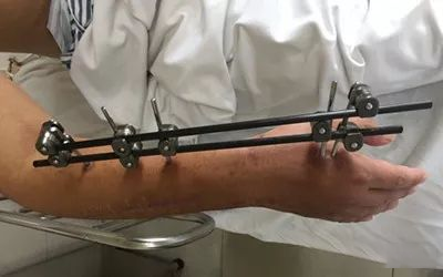 外固定架是骨固定方法之一,有不锈钢针、连接杆、钢针固定夹成。
