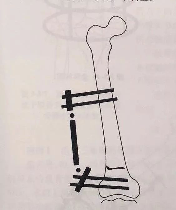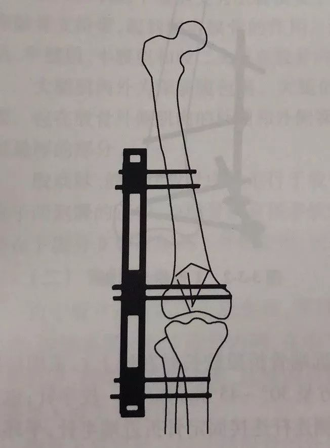 有时在股直肌和骨外侧肌间隙穿针,与弧形弓连接固定。短期使用,使早期构型更加稳定。