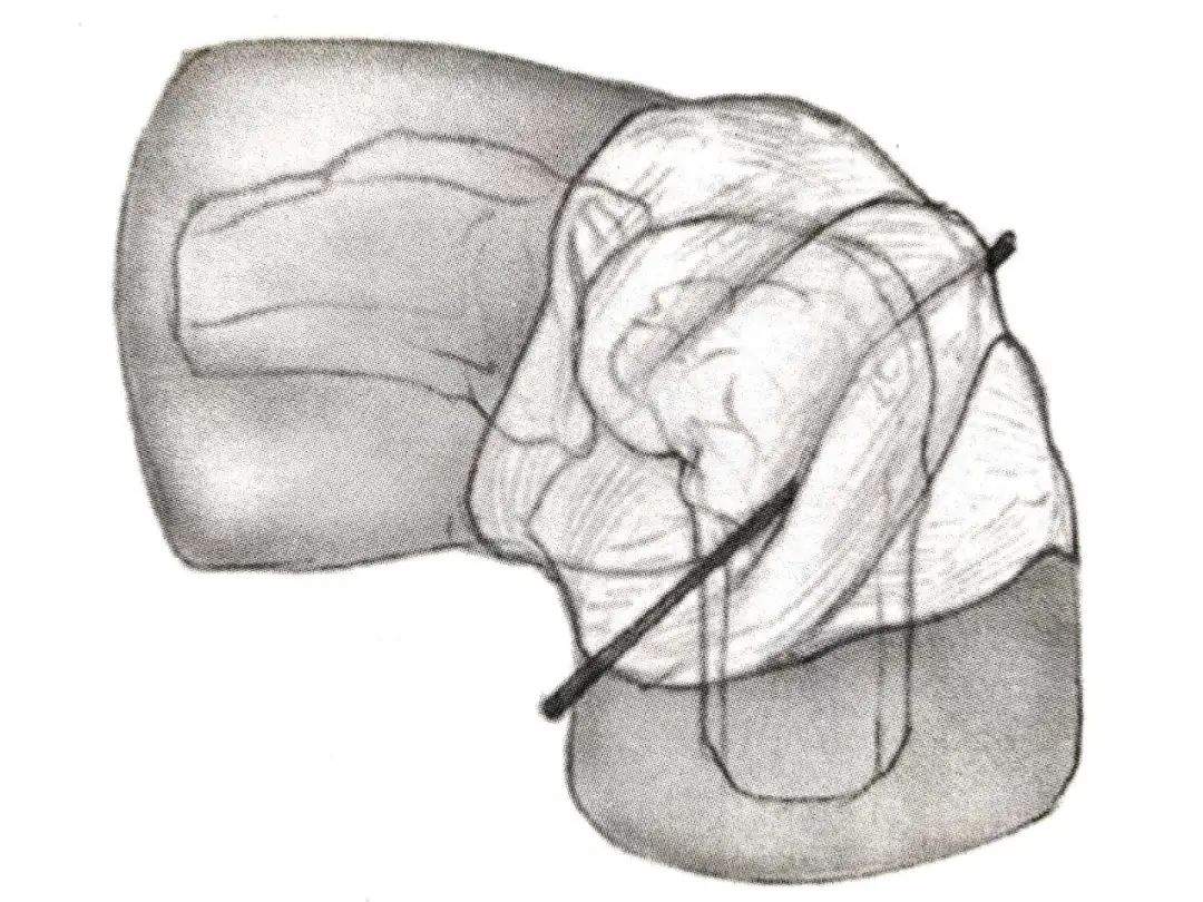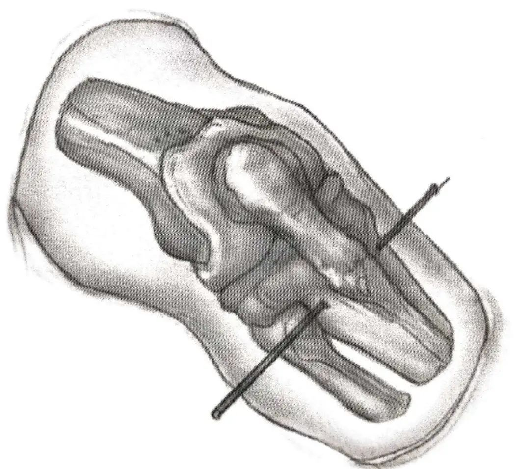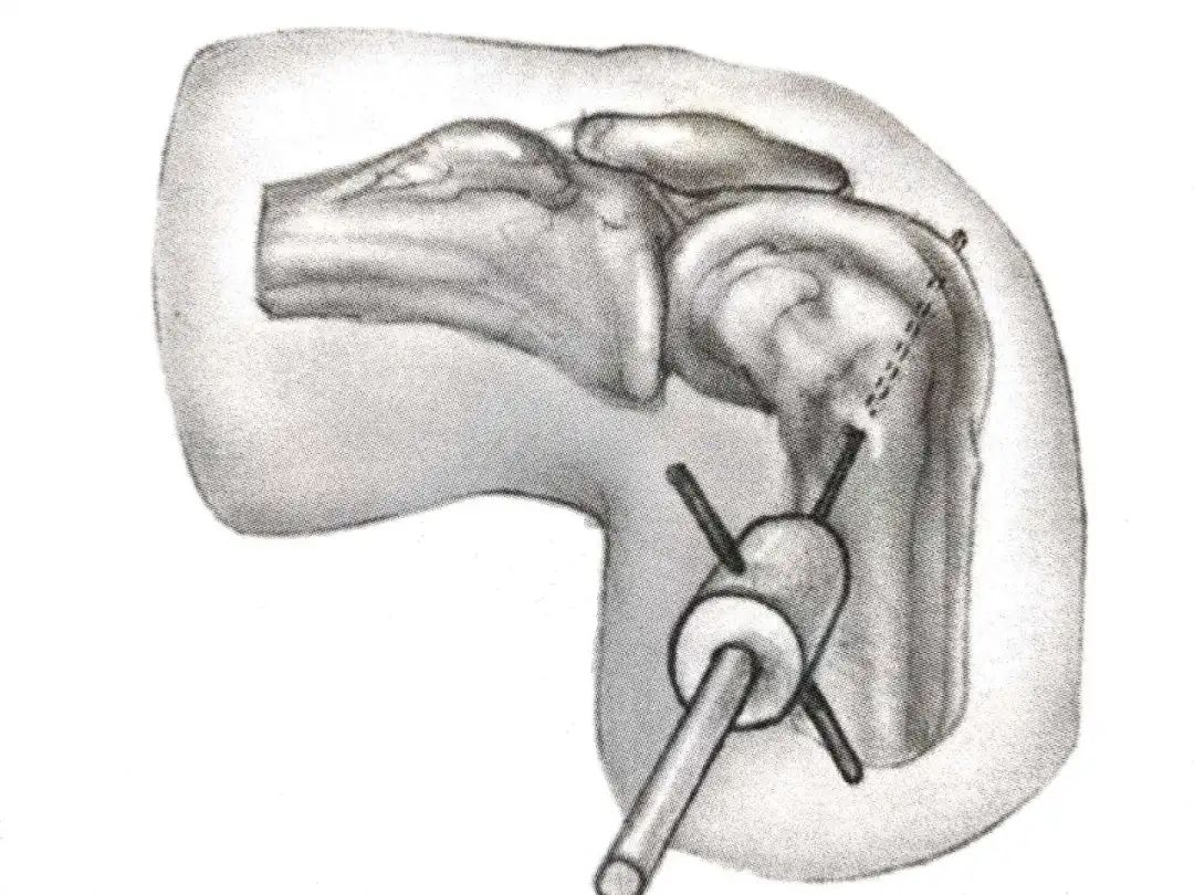 用止血钳在切口内钝性分离至内侧股骨皮质。用较粗的斯氏针(在成人0.48cm(3/16英寸)或在少年0.24cm(3/32英寸)),安装在Jacob卡头上,用手摇钻沿上述软组织间隙打入斯氏针。