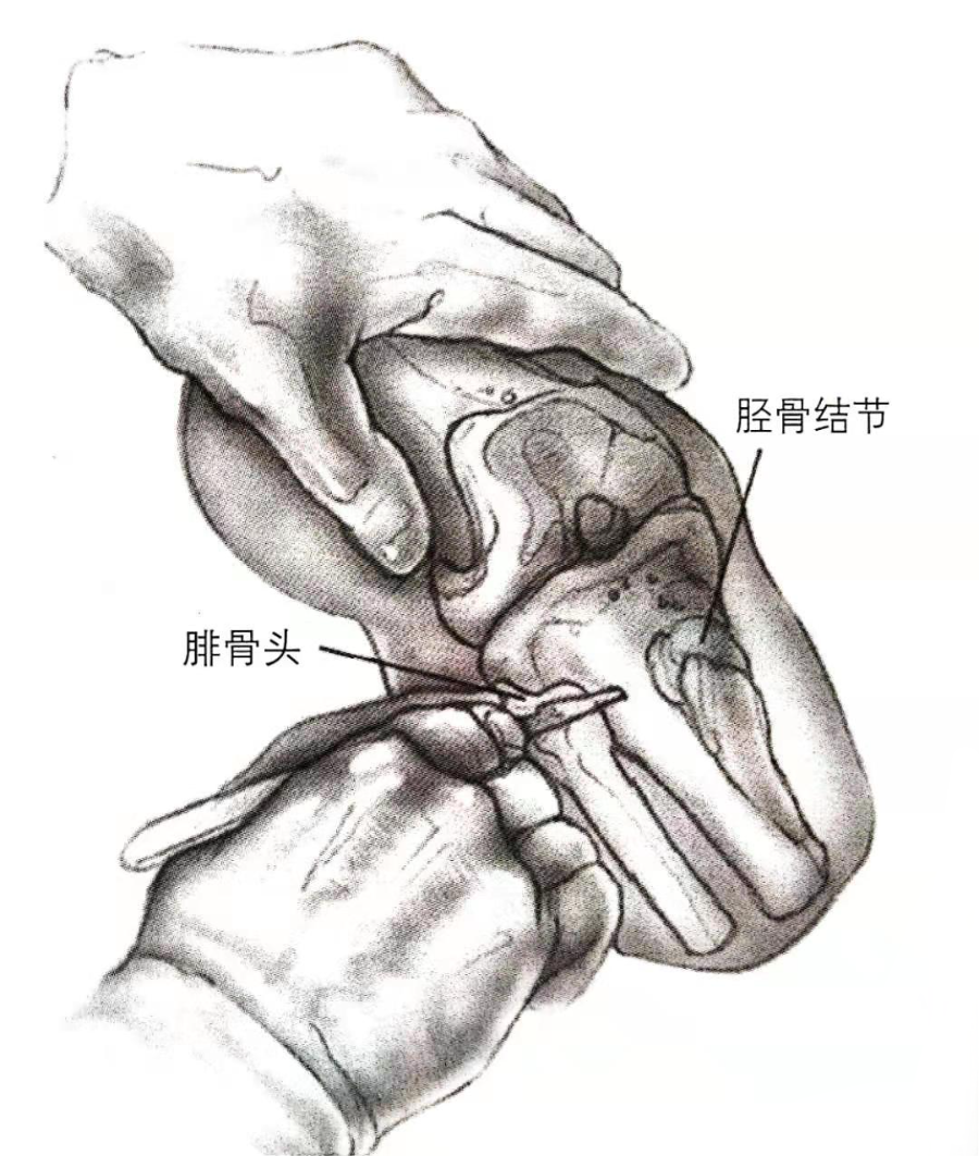 ▲ 垂直切开皮肤:在胫骨结节水平,腓骨头前缘前1~2cm处垂直切开皮肤