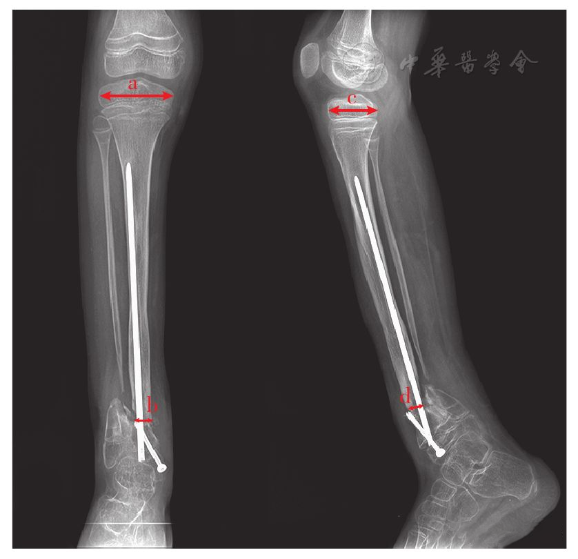 图1 假关节愈合处横截面积相对比的X线计算方法。a为正位片胫骨近端骺板横径,b为正位片再骨折部位胫骨横径,c为侧位片胫骨近端骺板横径,d为侧位片再骨折部位胫骨横径。(b×d)/(a×c)即假关节愈合处横截面积相对比