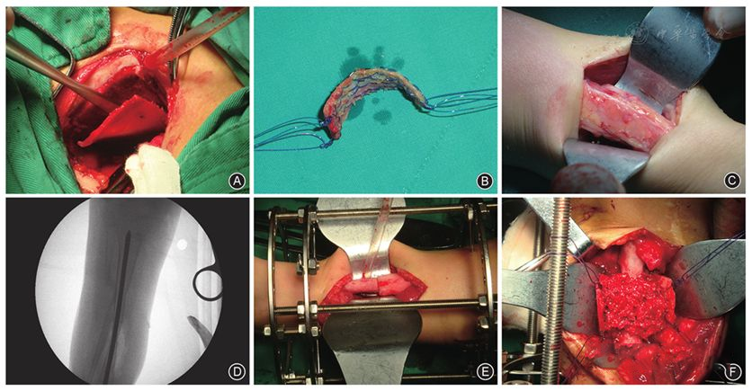 图2 女,3岁,左侧先天性胫骨假关节,行骨牵引针联合Ilizarov外固定架治疗 A 取大小约4 cm×4 cm的四边形髂骨外板 B 将取下的髂骨外板逐渐折弯成圆筒状,每孔穿人可吸收缝线并在四角预留缝线作为牵引捆扎线 C 显露假关节处纤维错构瘤样组织 D 术中"C"型臂X线机示经跟骨跖面固定骨牵引针 E Ilizarov外固定架加压固定假关节 F 从胫骨后方向前完整包裹胫骨假关节部位,以自体髂骨松质骨填充植骨