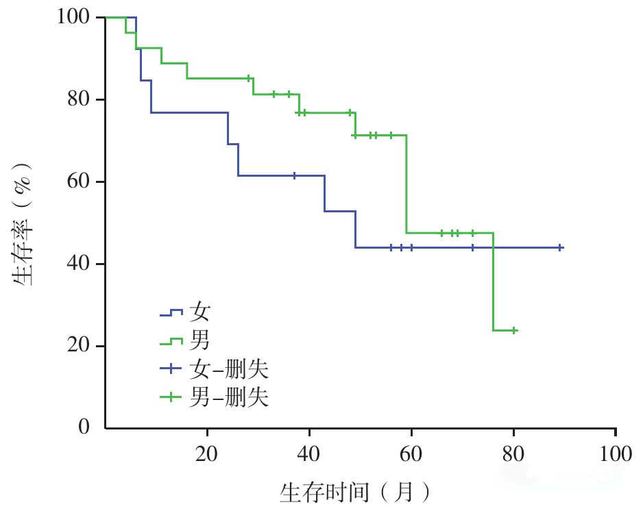 图4 不同性别无骨折生存曲线。在假关节愈合早期及5年之后不同性别的无骨折生存曲线有交叉,两者无骨折生存率的差异无统计学意义