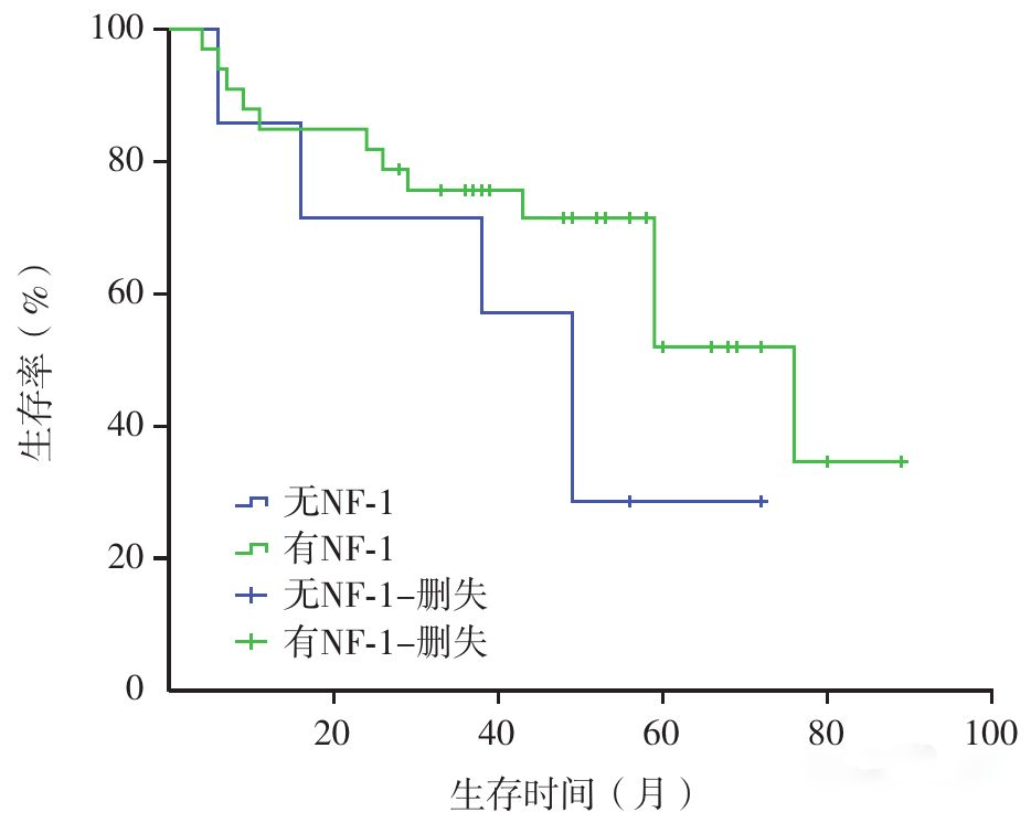 合并NF-1的患儿平均无骨折生存时间为60.8个月,中位无骨折生存时间为76.0个月;无NF-1的患儿平均无骨折生存时间为43.1个月,中位无骨折生存时间为49.0个月;两者无骨折生存率的差异无统计学意义(P>0.05,图5)。