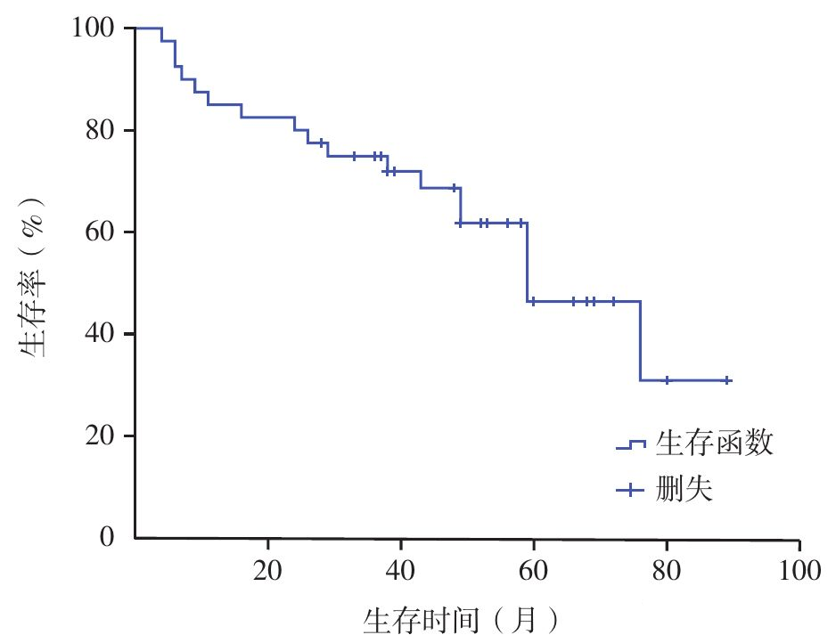 40例CPT采用联合手术获得骨性愈合后平均无骨折生存时间为57.7个月,中位无骨折生存时间为59.0个月,无骨折生存率在早期下降速度较快,第2年累积生存率为80.0%,第3年以后无骨折生存率下降速度减慢,第3年累积生存率为74.9%,第5年累积生存率为46.3%,之后基本保持不变,只有1例发生了再骨折(图3)。