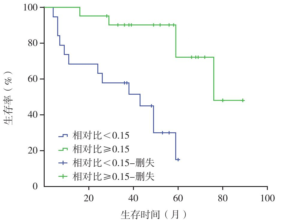 假关节愈合处横截面积相对比<0.15者平均无骨折生存时间为35.3个月,中位无骨折生存时间为43.0个月;相对比≥0.15者平均无骨折生存时间为74.0个月,中位无骨折生存时间为76.0个月;两者无骨折生存率的差异有统计学意义(P<0.05,图9)。
