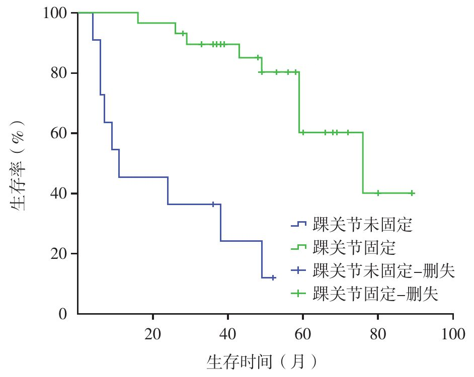 踝关节固定者平均无骨折生存时间为22.9个月,中位无骨折生存时间为11.0个月;踝关节未固定者平均无骨折生存时间为69.6个月,中位无骨折生存时间为76.0个月;两者无骨折生存率的差异有统计学意义(P<0.05,图8)。