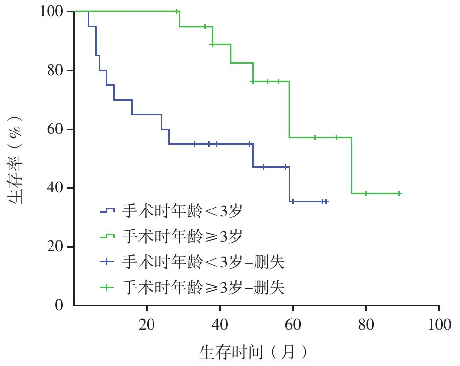 图6 不同手术时年龄无骨折生存曲线。假关节愈合早期,手术时年龄>3岁患儿无骨折生存率下降速度较手术时年龄<3岁者慢,差异有统计学意义
