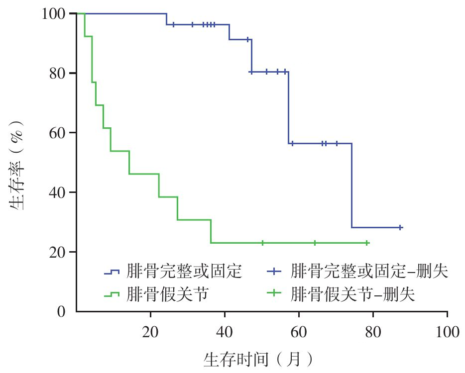 腓骨完整或远端融合、固定者平均无骨折生存时间为69.2个月,中位无骨折生存时间为76.0个月;伴腓骨假关节者平均无骨折生存时间为30.0个月,中位无骨折生存时间为16.0个月;两者无骨折生存率的差异有统计学意义(P<0.05,图7)。
