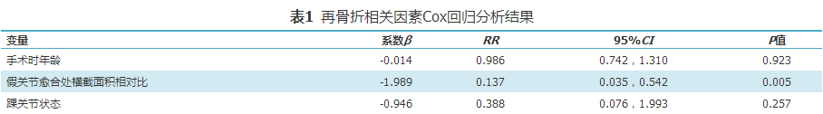 手术时年龄、踝关节状态对无骨折生存率无影响,假关节愈合处横截面积相对比<0.15、合并腓骨假关节为导致术后出现再骨折的危险因素(表1)。