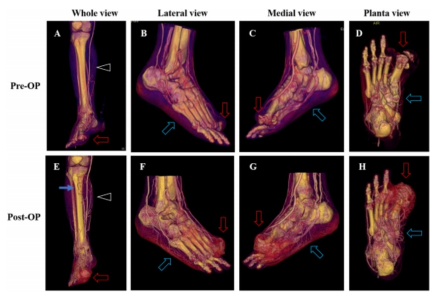 上图为胫骨横向骨搬移术前、术后CT血管造影展示的患肢血运变化。