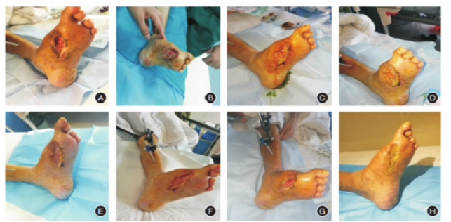 上图为胫骨横向骨搬移治疗糖尿病足。注:A.术前创面溃疡面积较大、脓性渗出物较多;B.术中彻底清创、VSD负压吸引拆除后见创面肉芽组织再生,创面红润;C.术后3d;D.术后1周;E.术后2周;F.术后3周;G.术后4周创面基本愈合结痂;H.术后8周,创面愈合,无疼痛。doi:10.3969/j.issn.1006⁃5725.2021.22.025.