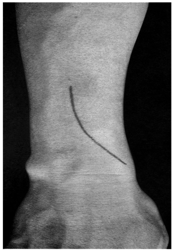 图2-3 切口起自桡骨茎突,向上沿桡骨后缘并略偏向尺侧