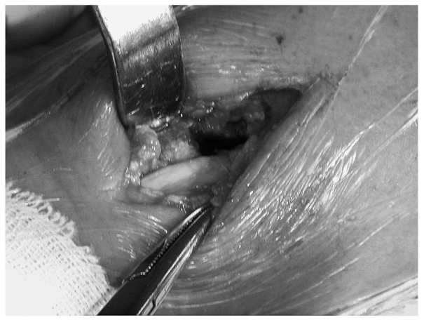 图2-4 显露桡骨远端背侧骨缺损区和移位的骨片