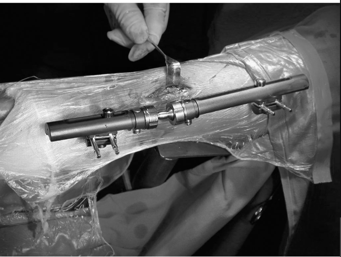 桡骨远端不稳定骨折是主要的手术指征,包括:①桡骨远端背(掌)侧皮质粉碎,关节面移位>2mm;②掌倾角向背侧倾斜超过20°~25°;③桡骨短缩> 5mm;④复位后不稳定,易发生再移位。骨折在纵向牵引下骨折块复位困难,骨折端的骨皮质支撑不满意,在骨折端夹有肌腱或骨膜。对于严重的关节内粉碎骨折,桡骨短缩明显,内固定螺钉无有效固定位置的病例,外固定架固定是首选方法。如Frykman分型中的Ⅶ、Ⅷ两型,通用分类法中的Ⅱ、ⅣA、ⅣB型,关节内四部分骨折等首先应考虑外固定架。此患者桡骨远端背侧皮质粉碎,复位后不稳定,易发生再移位。腕背侧移位的骨片闭合复位很难达到满意的位置。