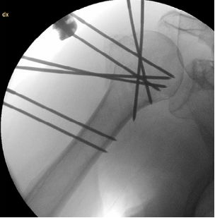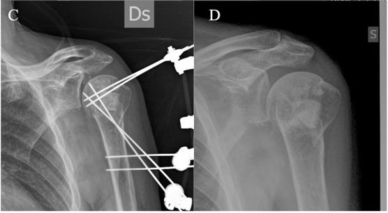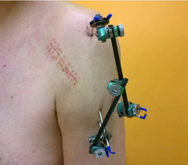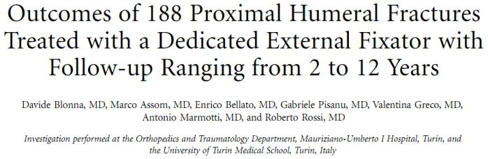 固定方式通常包括接骨板螺钉或髓内钉。而来自意大利的Davide团队主攻以外固定架治疗肱骨近端骨折,改进了克氏针的固定结构,从生物力学到临床随访研究