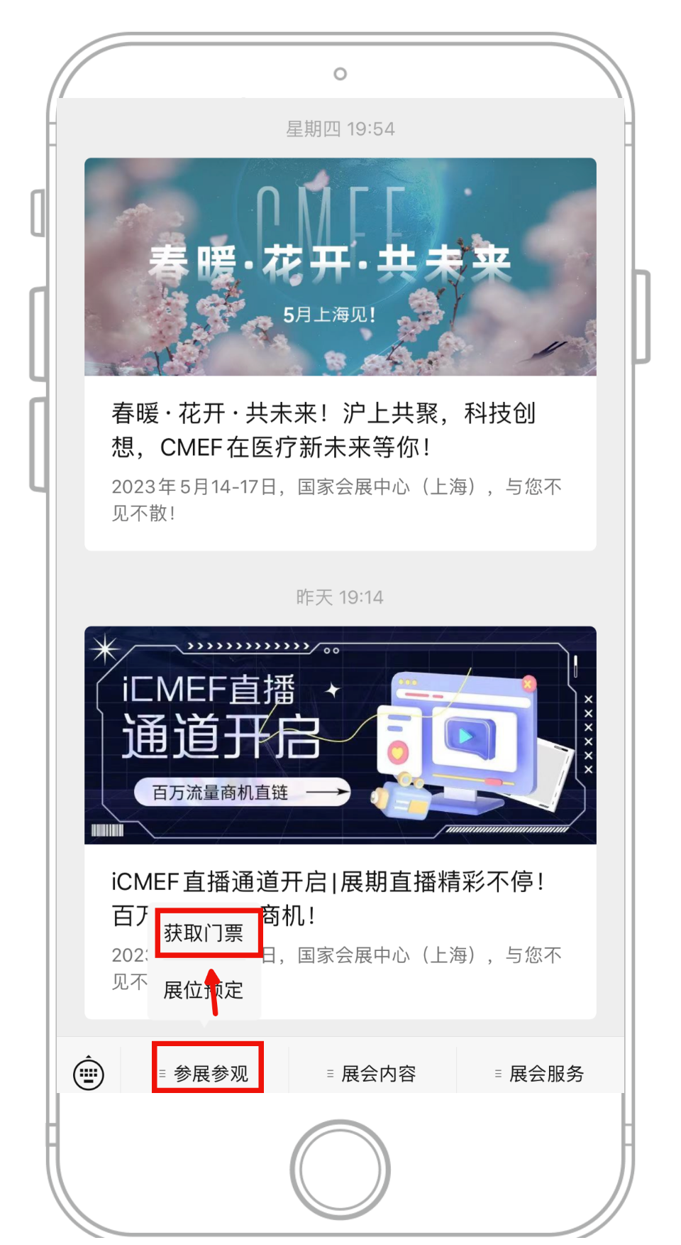 扫描下方登记二维码或关注CMEF官微点击[获取门票]后点击[申请入场券]