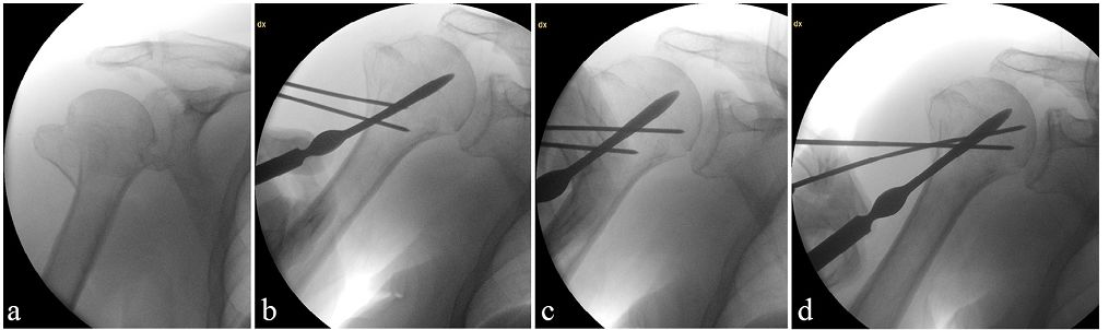 C臂机透视,螺纹针撬拨复位后,植入一组螺纹针固定。