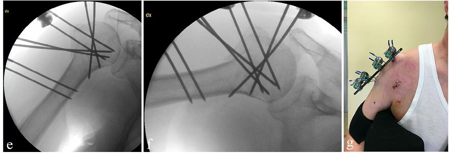肱骨近端3部分骨折在老年患者中很常见,内固定方式通常用接骨板。使用外固定架来固定,技术难度+吃光风险,绝非易事。好处是创伤小,不易损伤肱骨头的血供。