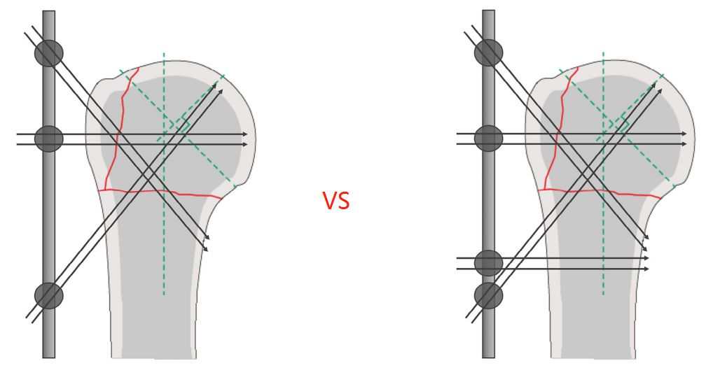 如果把每组螺纹针看成是锁定螺钉的话,可以更好理解B结构的优势,相当于在干骺端植入一枚锁定螺钉,而外架相当于一块锁定板。